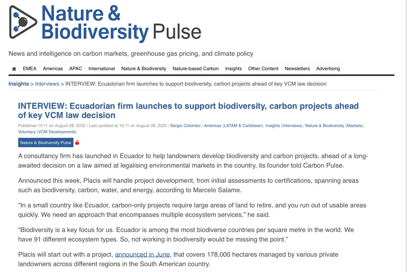 Me complace compartir que Carbon Pulse, una de las publicaciones internacionales más reconocidas en el mundo en los mercados de carbono y biodiversidad, me entrevistó la semana pasada con motivo del lanzamiento de mi nueva firma de consultoría: PLACIS (Planet Life & Carbon Integrated Sustainability).